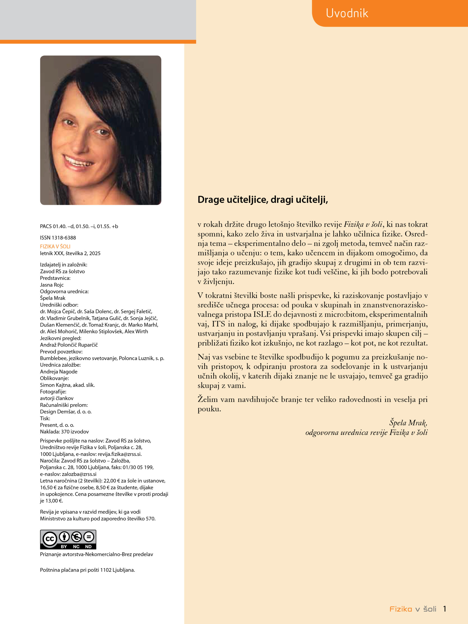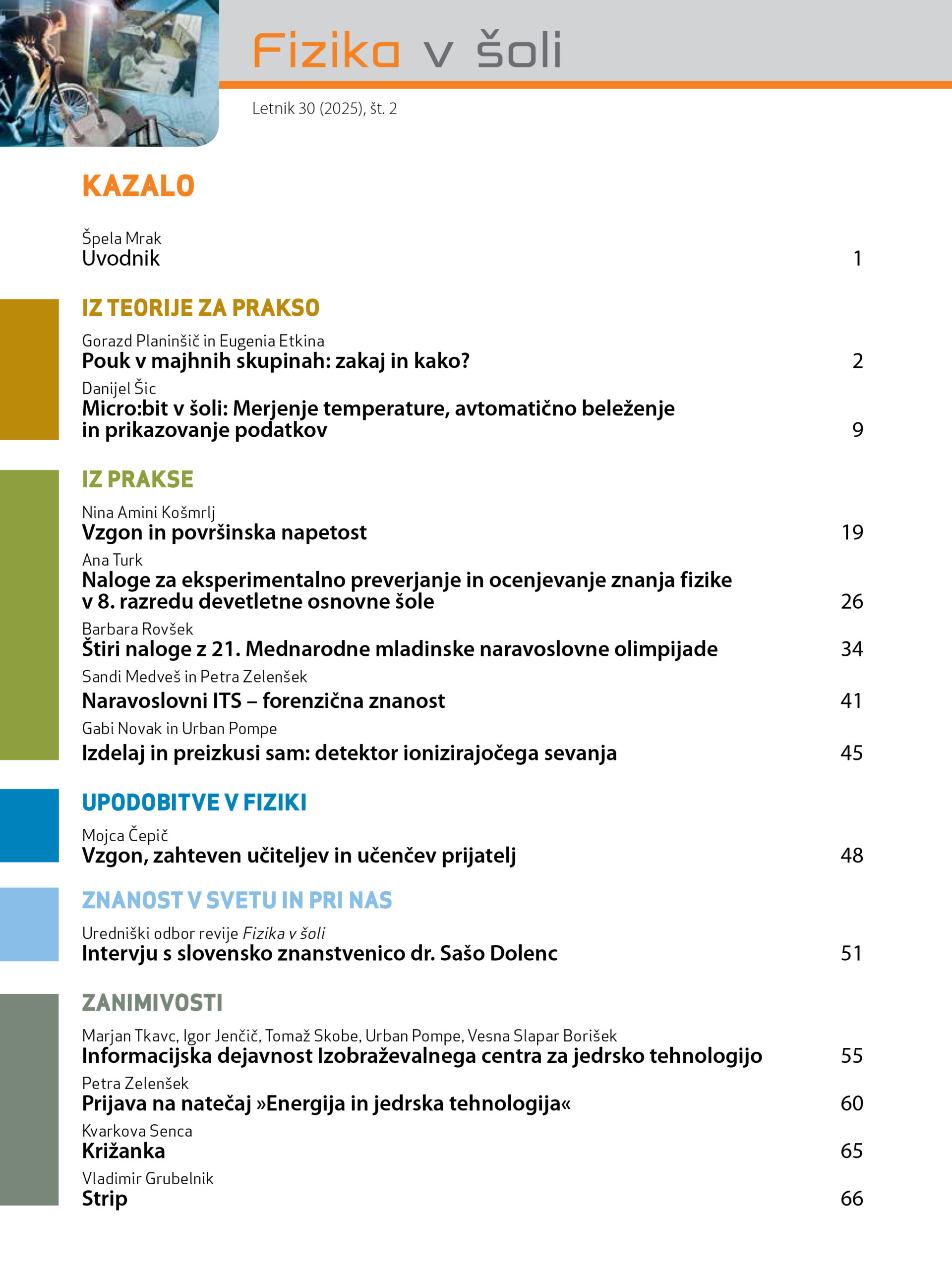 V tokratni številki boste našli članke, ki raziskovanje postavljajo v središče učnega procesa: od pouka v skupinah in znanstvenoraziskovalnega pristopa ISLE do dejavnosti z micro:bitom, eksperimentalnih vaj, ITS in nalog, ki dijake spodbujajo k razmišljanju, primerjanju, ustvarjanju in postavljanju vprašanj. Vsi članki imajo skupen cilj – približati fiziko kot izkušnjo, ne kot razlago – kot pot, ne kot rezultat.
