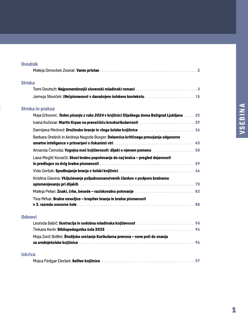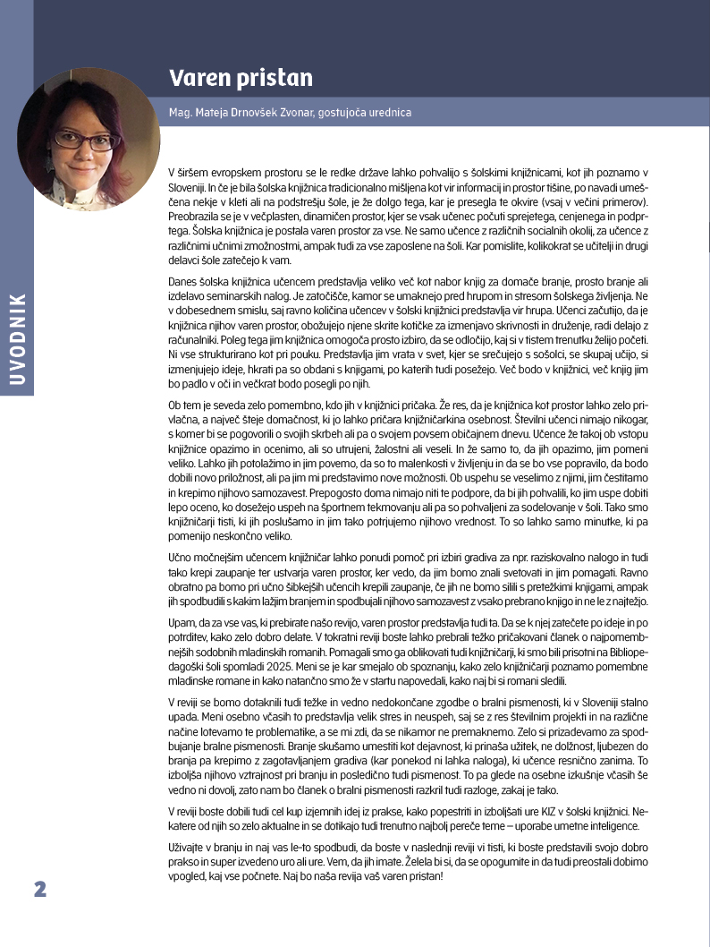 Gostujoča urednica vas vabi v varen pristan; najprej naj bo šolska knjižnica varen prostor, zatočišče, v katerem učenci dobijo podporo, pohvalo, potrditev. In hkrati naj bo naša revija varen pristan za vas, ki iščete navdih, odgovore na strokovna vprašanja, potrditev, kako zelo dobro delate. V rubriki Stroka objavljamo raziskavo o najpomembnejšem slovenskem mladinskem romanu in razmislek o bralni pismenosti v trenutnem slovenskem družbenem in šolskem kontekstu. Rubrika Stroka in praksa prinaša raznolike teme, pišemo o tednu pisanja z roko, medpredmetnem povezovanju, družinskem branju, umetni inteligenci, precej tudi o bralni pismenosti in vlogi šolske knjižnice. Sklenemo z odmevnimi dogodki in prisrčno iskrico. Vabljeni k branju.