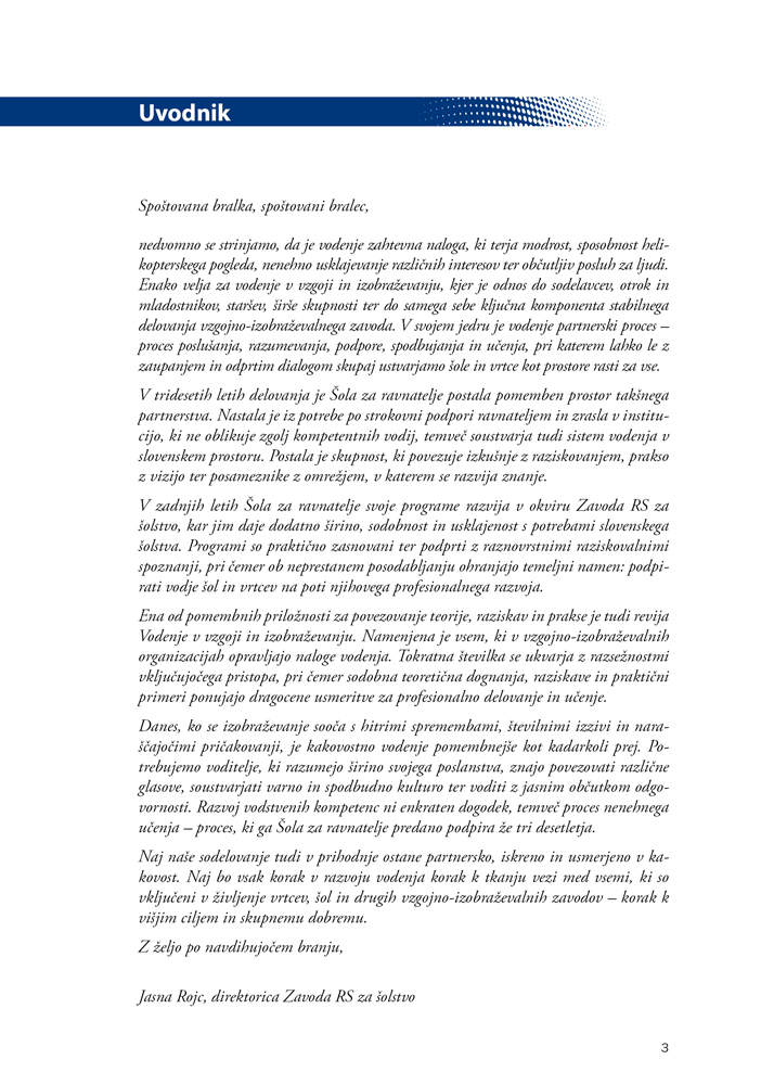 Dobrodošli v jubilejni izdaji revije Vodenje v vzgoji in izobraževanju. Ko praznujemo trideset let Šole za ravnatelje, ne obeležujemo zgolj obletnice ustanove, temveč zgodbo o ljudeh, ki so verjeli v moč vodenja kot temelj kakovostnega izobraževanja.